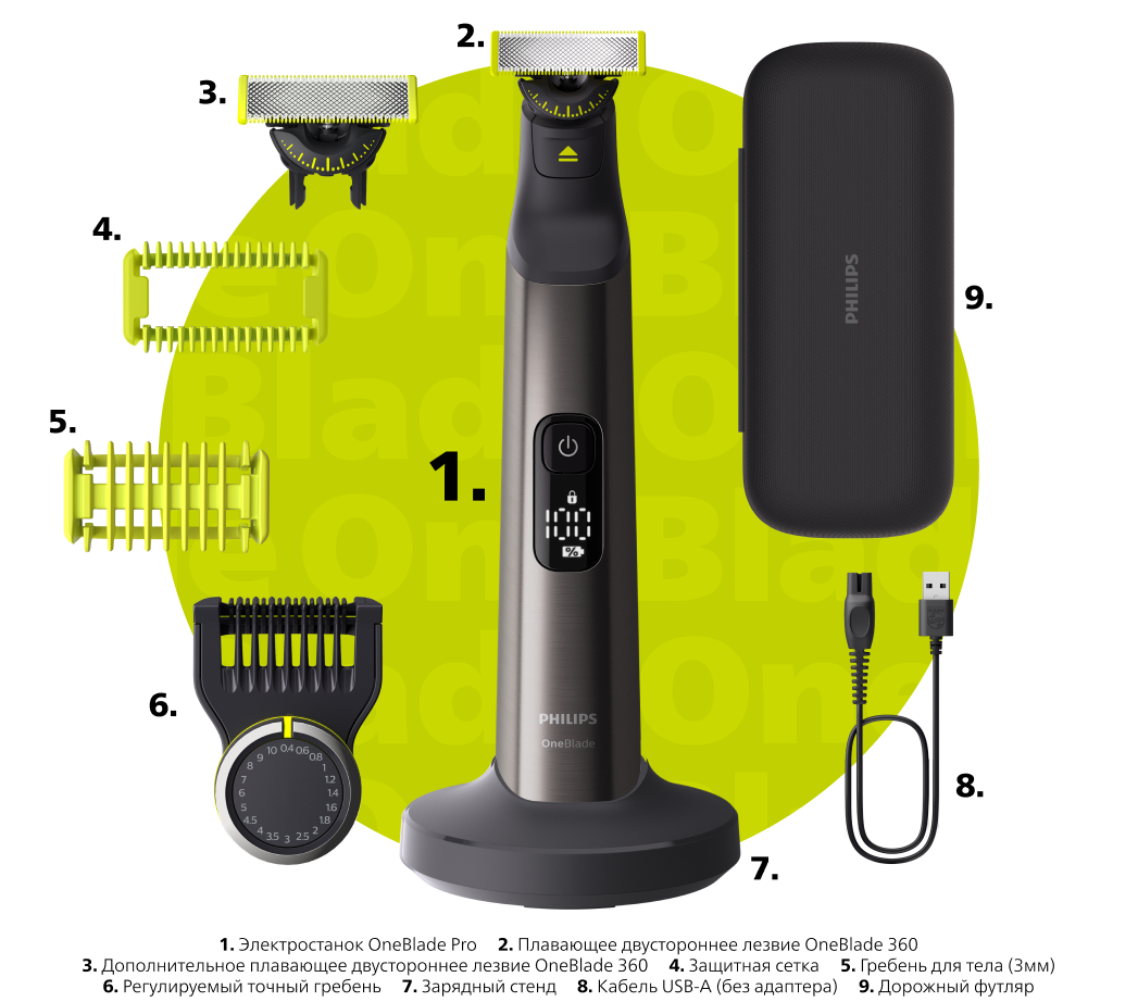 С электростанком Philips OneBlade Pro вы сможете создавать четкие контуры благодаря уникальному двустороннему лезвию. Для дополнительного удобства и лучшего ухода за электростанками можно двигать в любом направлении, что обеспечивает комфортное бритье даже на чувствительных участках. Philips OneBlade Pro – это простое решение для быстрого ухода, чтобы ваш образ всегда оставался идеальным.
