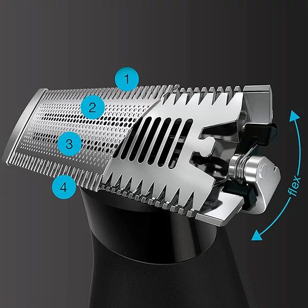 Модель оснащена фірмовим 4D-лезом із чотирма різальними елементами: двома центральними сітками та двома боковими тримерами. Така конструкція забезпечує ефективне зрізання волосся будь-якої густоти та жорсткості, залишаючи шкіру гладкою без подразнень.