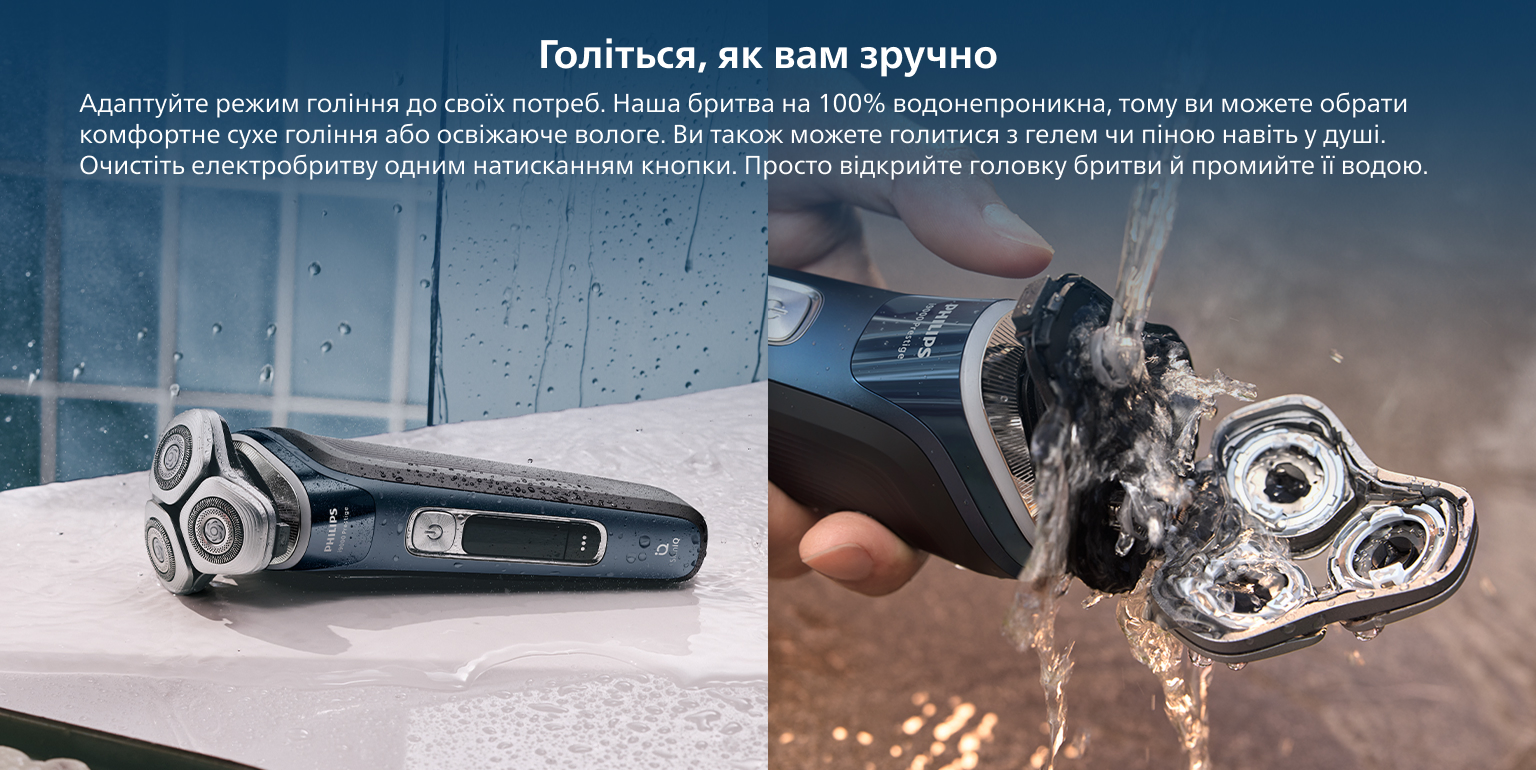 Повністю гнучкі та компактні бриючі головки зі спеціальними рельєфами для дбайливого натягування шкіри динамічно адаптуються до вигинів вашого обличчя. Головки забезпечують постійний контакт зі шкірою з більшою на 20% точністю, щоб захопити волоски на складних ділянках шиї та під носом.